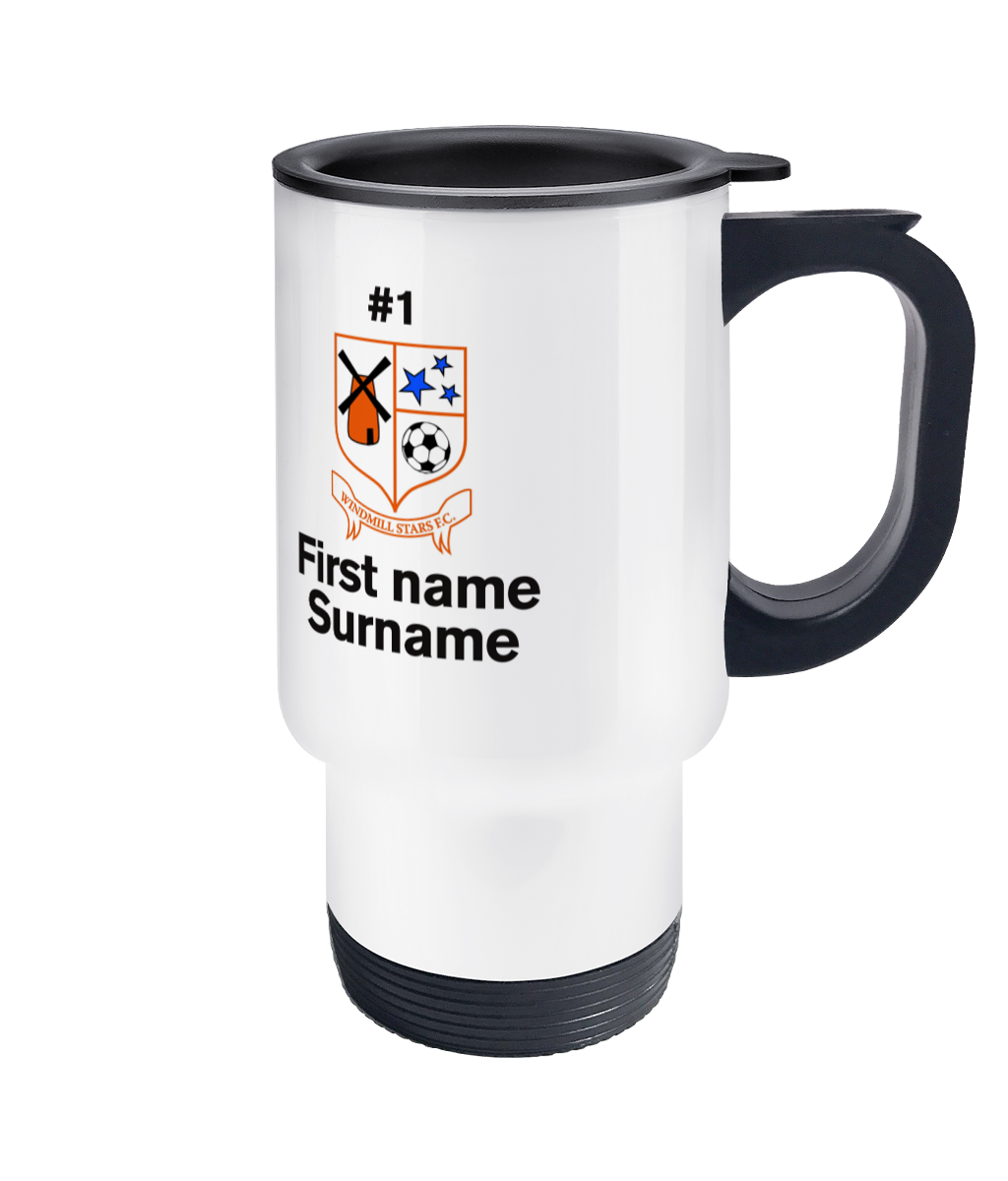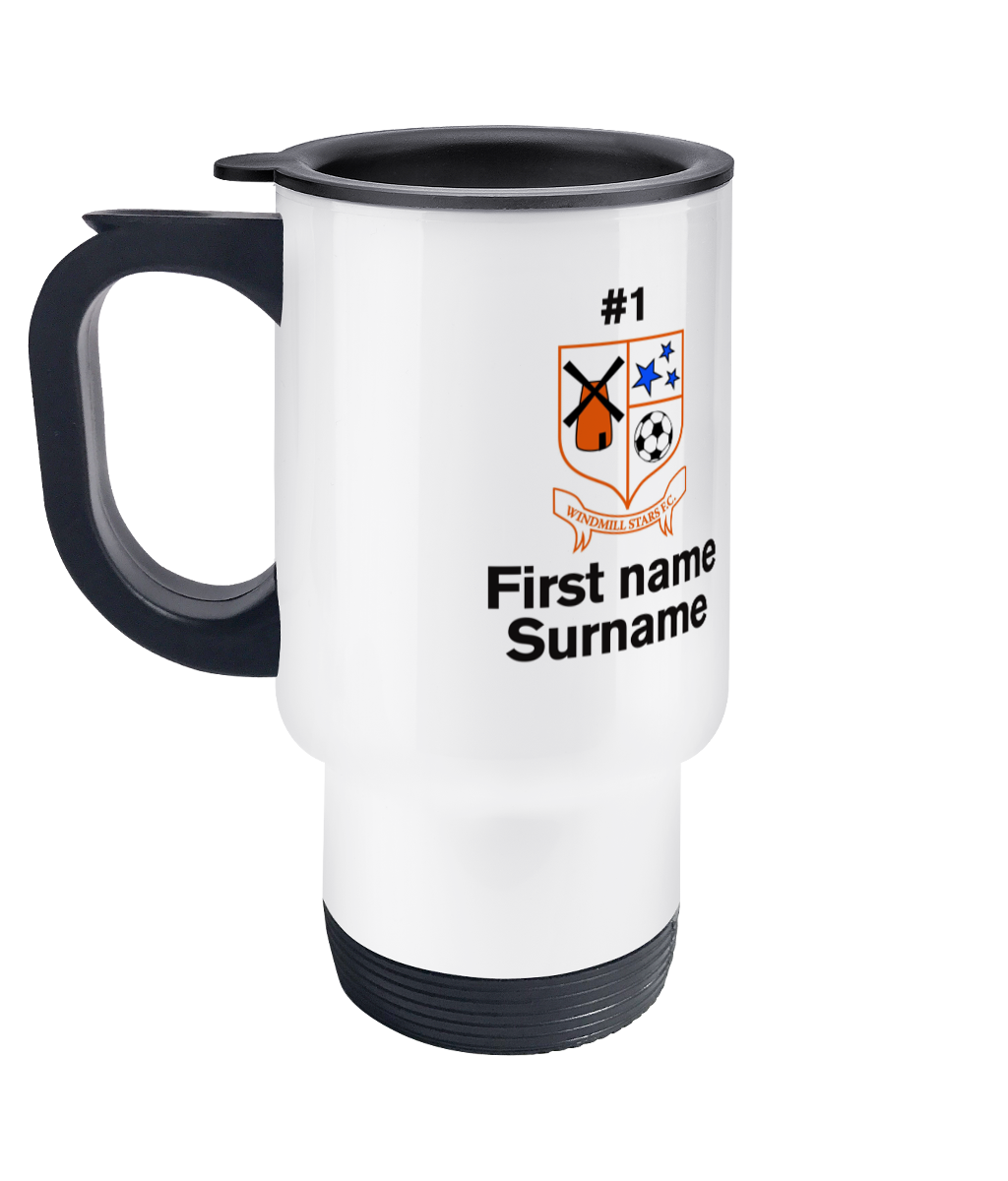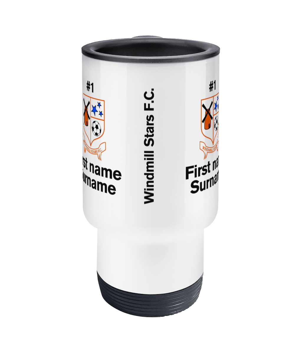 Take your team pride on the go with our Personalised Windmill F.C. insulated travel mug. Perfect for away matches, early starts, or busy days on the move — keeping your brew hot and your club spirit strong.